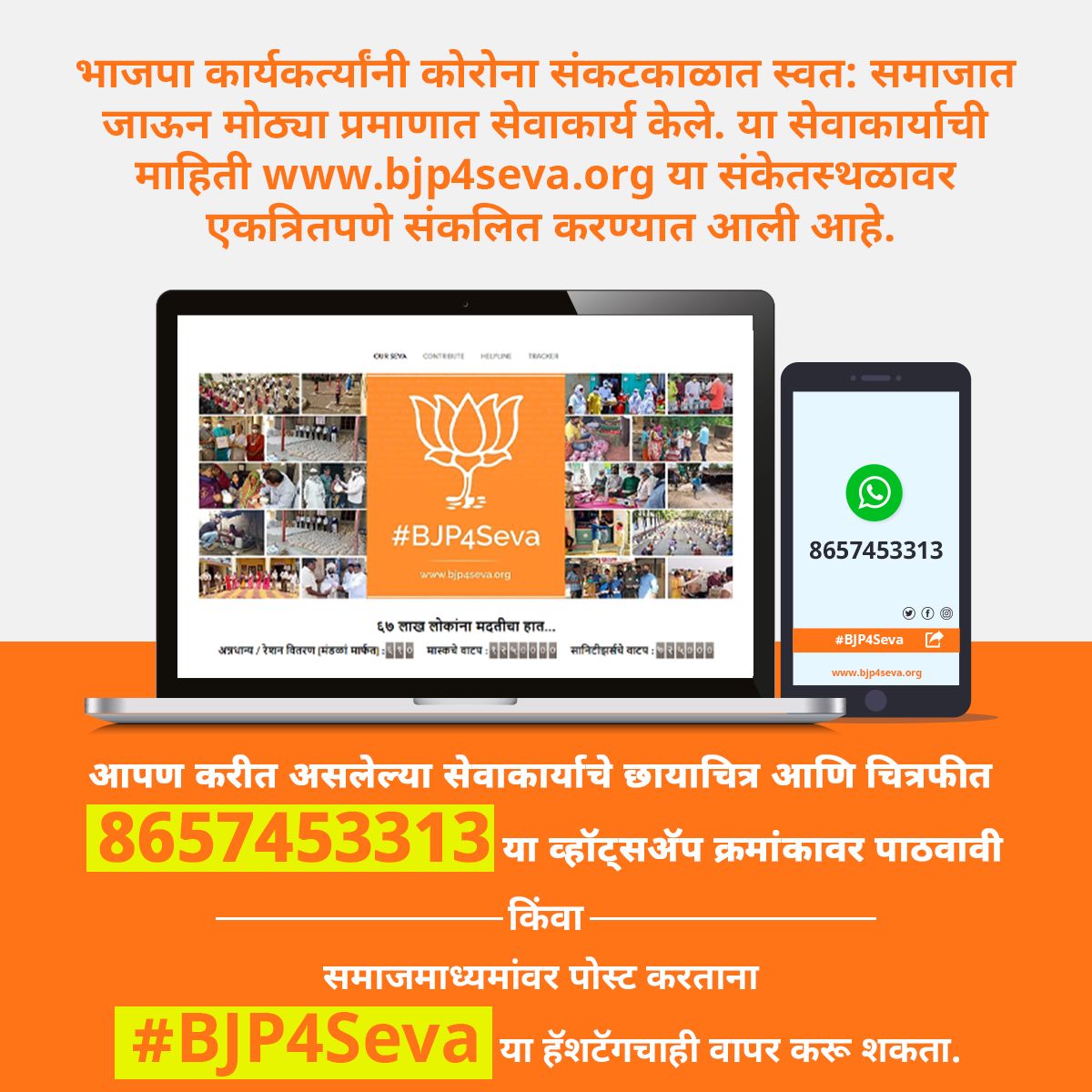 कोरोना महामारीच्या दुसऱ्या लाटेमध्ये राज्यात झपाट्याने रुग्णवाढ झाली. शहरी भागांबरोबरच ग्रामीण भागातही कोरोनाच्या संसर्गाने अक्षरश: हाहाकार माजवला. संसर्गित रुग्णांच्या उपचाराबरोबरच लोकांचे जीव वाचवणे हे एक मोठे संकट उभे राहिले. सरकारी उपचार यंत्रणा अपुरी पडू लागल्यानंतर रुग्णांच्या उपचारासाठी व्यवस्था उभारणे हे एक मोठे आव्हान ठरले. अशा वेळी समाजाप्रती असलेल्या सेवा कर्तव्याची जाणीव ठेवत भारतीय जनता पार्टीच्या सर्वच कार्यकर्त्यांनी या लढाईविरुध्द कंबर कसली आहे. भारतीय जनता पक्षाचे कार्यकर्ते, नगरसेवक,खासदार, आमदार यांनी विविध कोविड केअर सेंटर्स, आयसोलेशन सेंटर्स,लसीकरण केंद्र,ऑक्सिजनेटेड बेडस्, क्वारंनटाईन रुग्णांसाठी ऑक्सिजन काँन्सट्रेटर्स मशीन्स अशा विविध सेवांच्या माध्यमातून रुग्णांच्या सेवेसाठी पुढाकार घेतला आहे.